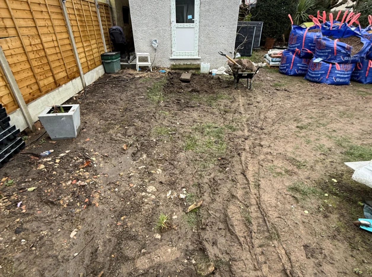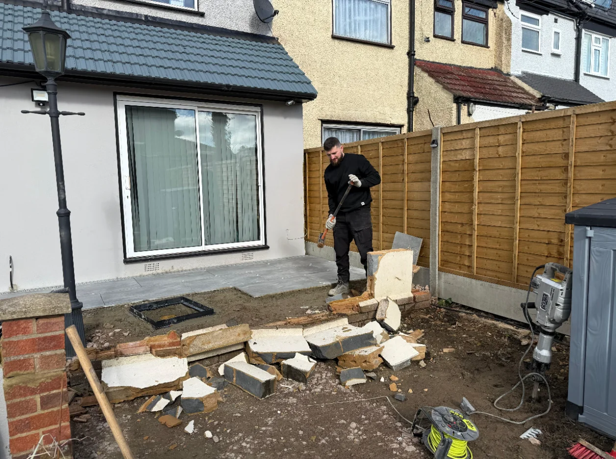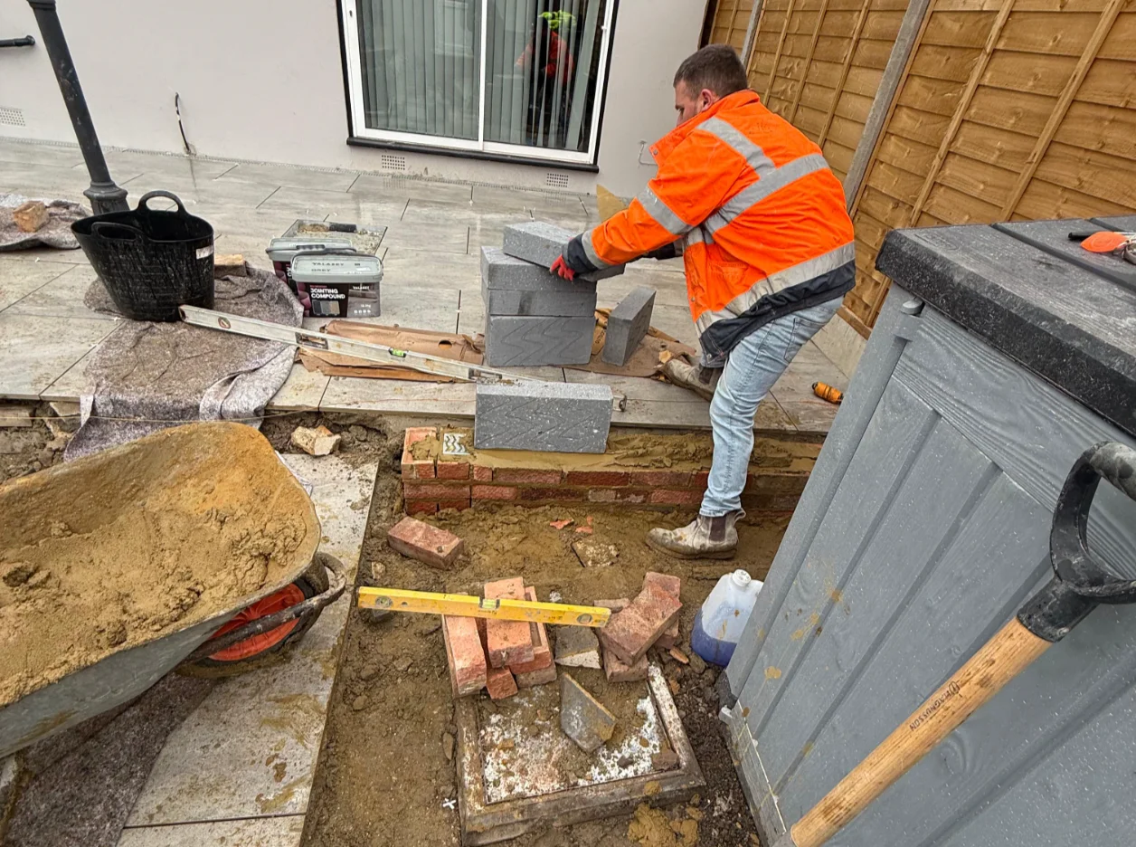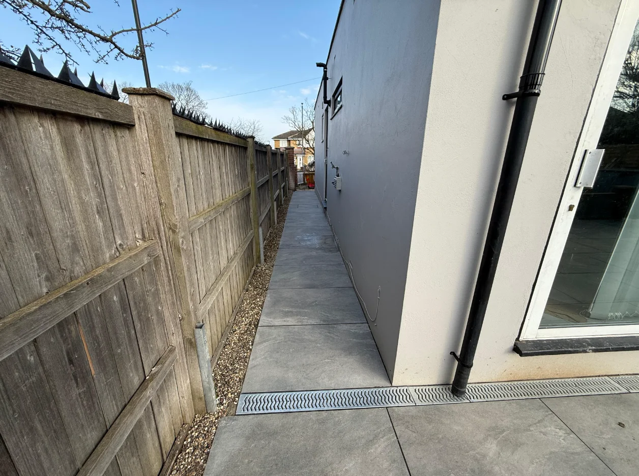 The client wanted a long-lasting and low-maintenance solution that would improve the overall appearance of the garden.To achieve this, we recommended installing 54 m² of porcelain paving, which is highly durable, weather resistant, and easy to maintain. The project also included the removal of the existing patio, full ground preparation, and the installation of a Type 1 MOT sub-base to ensure a strong and stable foundation. In addition, we installed a 14-metre eco drain system and three manhole covers to improve water drainage and prevent future water accumulation.As part of the renovation, the paving area was extended and the existing wall was carefully dismantled and rebuilt with two new pillars, providing both structural support and an improved visual finish.