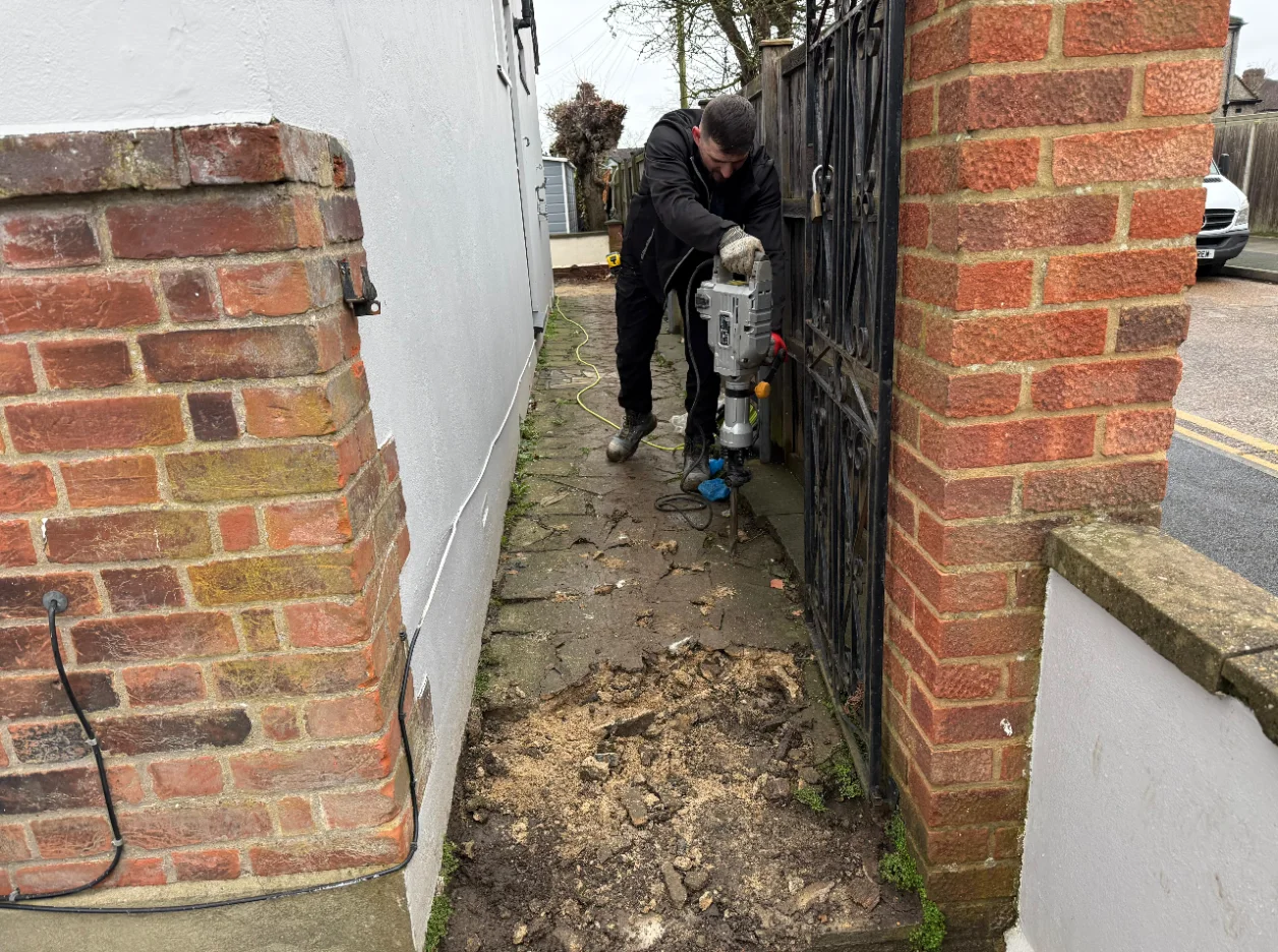 Ground conditions required careful excavation, the installation of Type 1 MOT, and thorough compaction to create a solid base that would prevent future movement or sinking of the paving.Another challenge involved installing the 14-metre eco drain system and integrating three manhole covers within the paving layout while maintaining proper drainage and a clean visual finish.In addition, the project required the careful removal of the existing wall and the construction of a new wall with two pillars, which involved creating proper foundations.Achieving a consistent, high-quality finish across the paving, grouting, and brickwork required careful planning and attention to detail throughout the project.